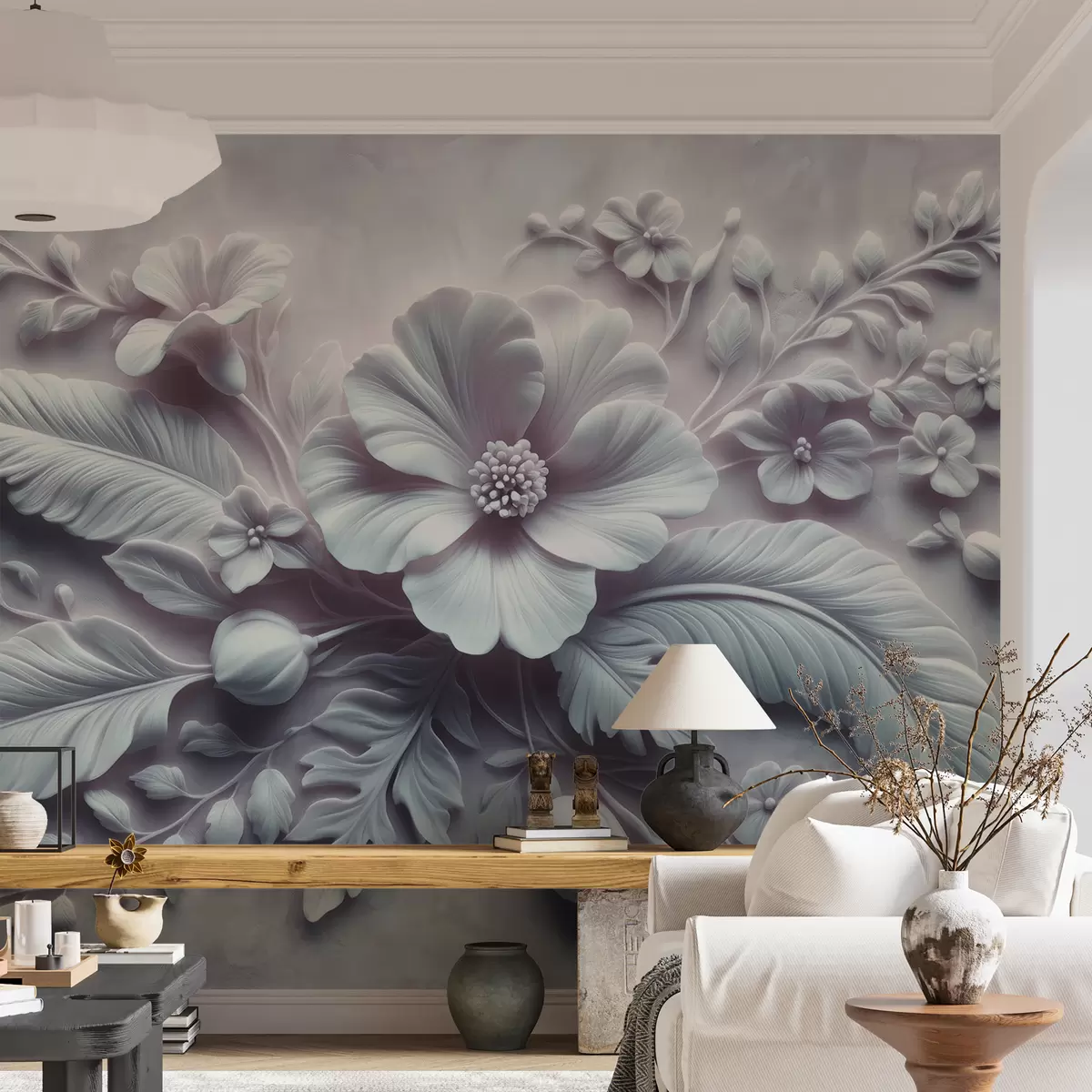 Fototapeten 3D-Relief-Wandbild mit Federn und Blumen, mit einer großen Mohnblume in hellblauen Farben N° w01340v2