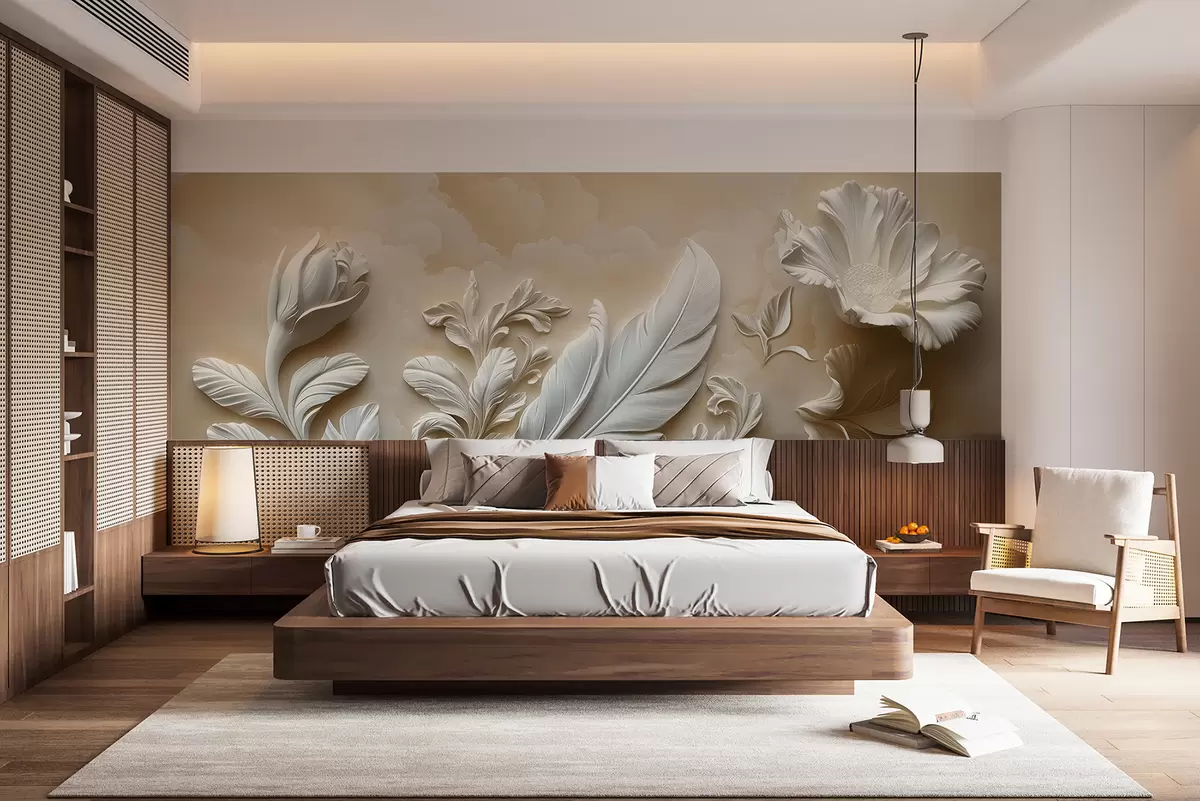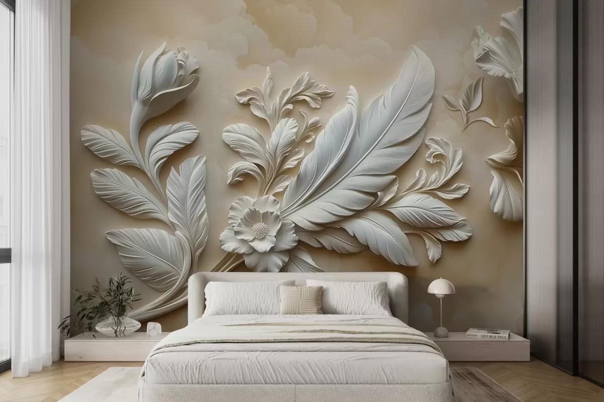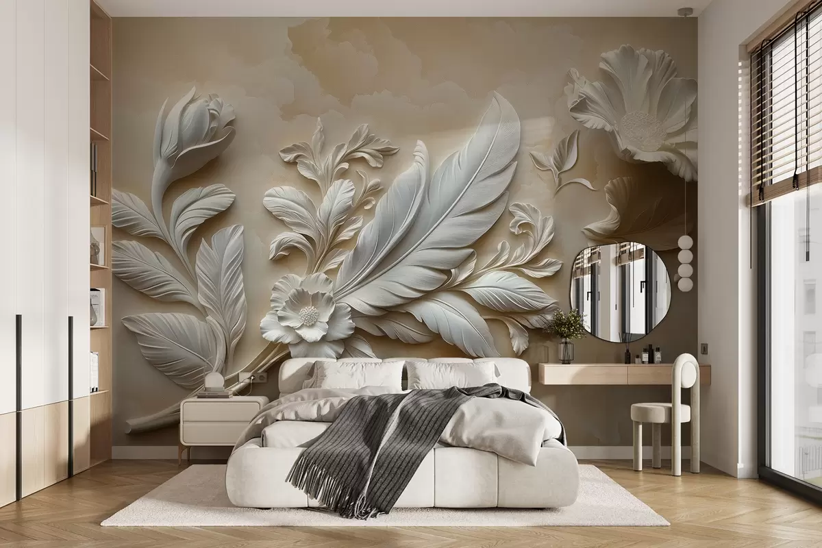 Fototapeten Anmutige Reliefblumen mit Blättern und Federn in Beigetönen N° w01355