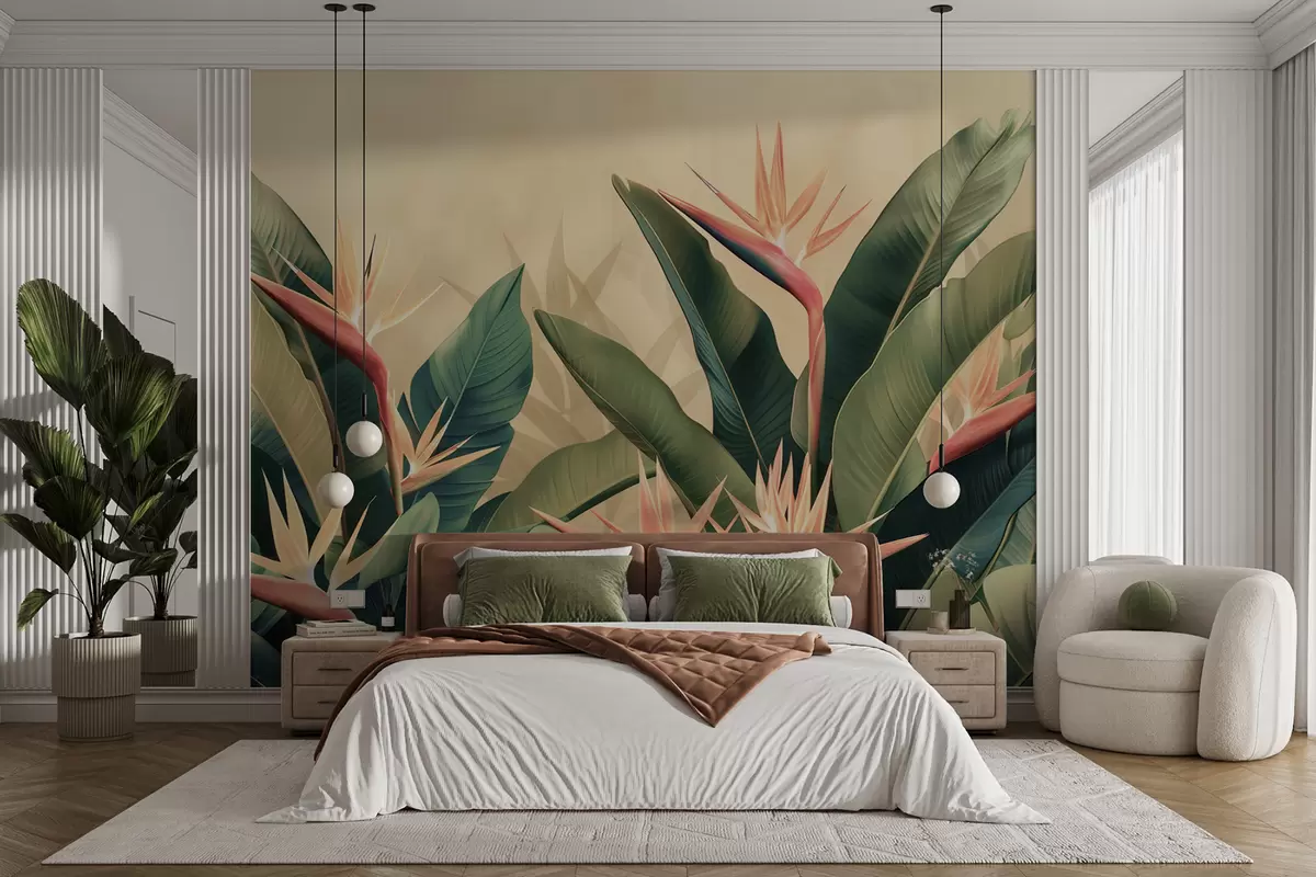 Fototapeten Üppiges Arrangement aus tropischen Blumen, umgeben von großen dunkelgrünen Blättern N° w01484v1