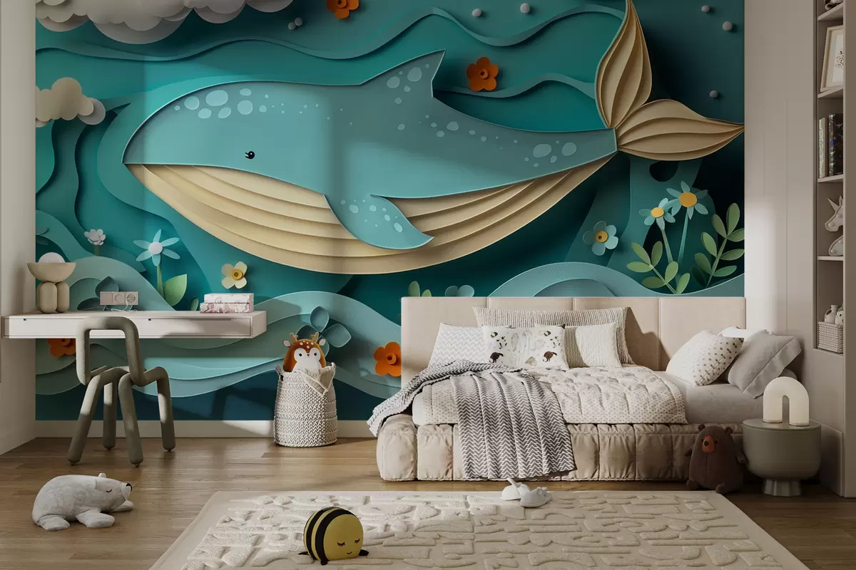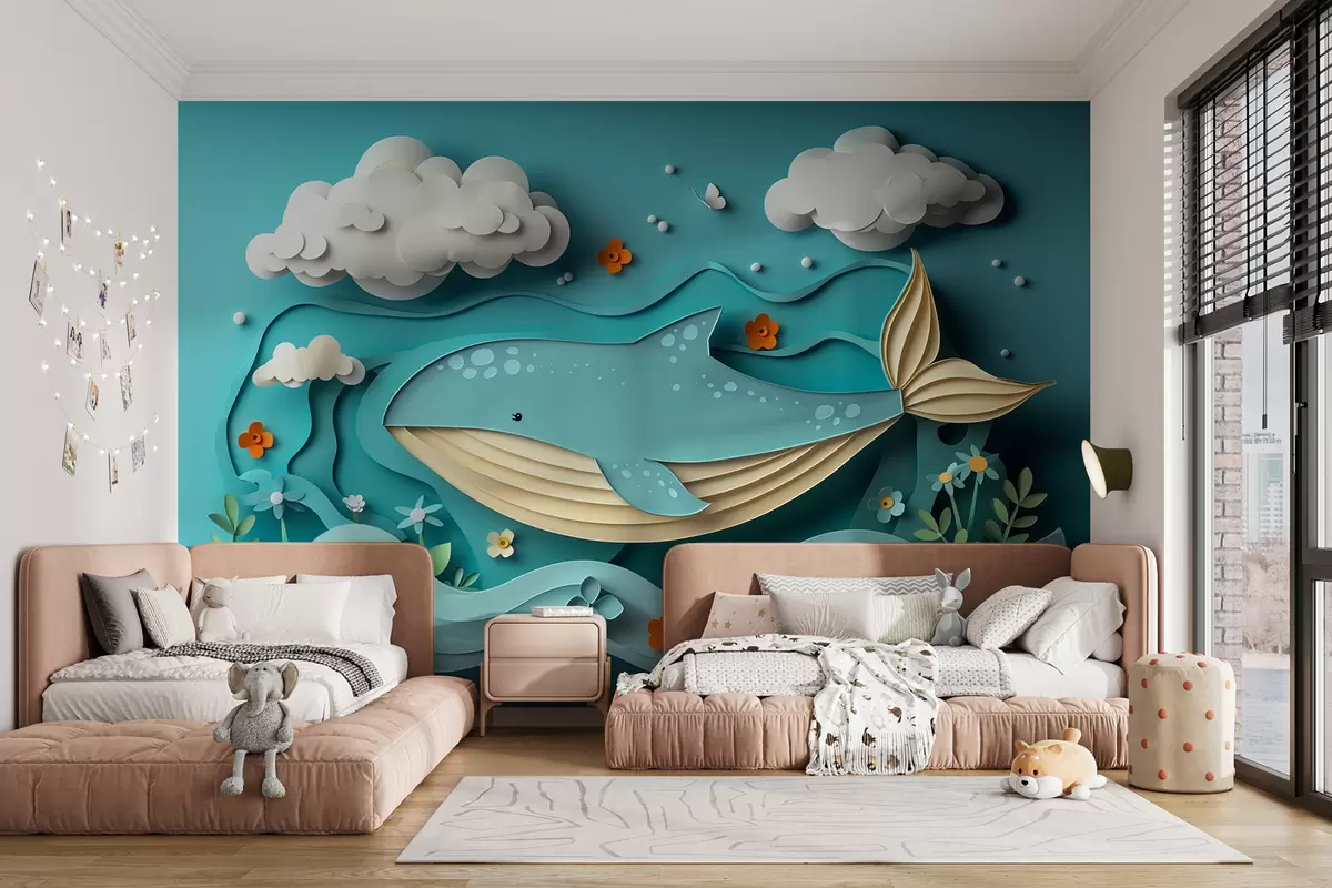 Fototapeten Verspielter Wal in den Wolken im Papierschnitt-Stil, 3D-Effekt N° w01496