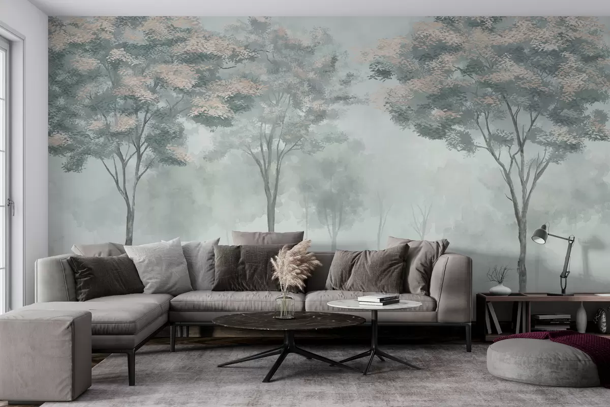 Fototapeten Neblige Waldsilhouette in den Farben Grün, Hellgrau und Beige N° w01599