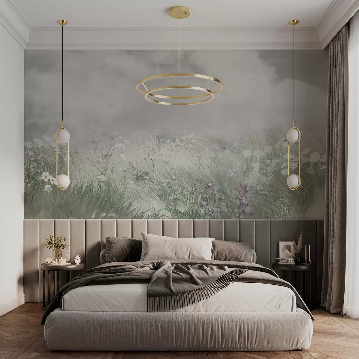Fototapeten Wilde Blumen und Gräser mit grauem Himmel und Wolken N° w01624v3