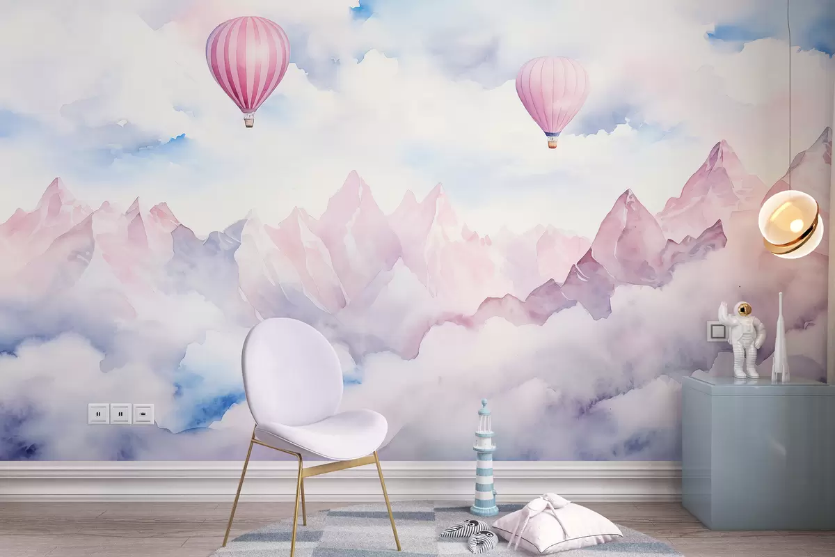 Fototapeten Schöne Berglandschaft mit Luftballons, Aquarell N° w01792
