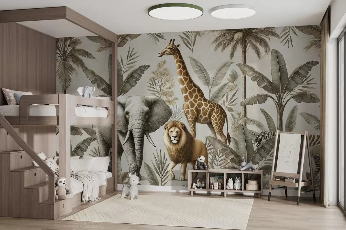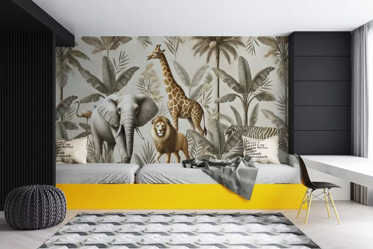 Fototapeten Safari Kindertapete mit tropischer Landschaft und verschiedenen Tieren in eleganten Farben N° w01956