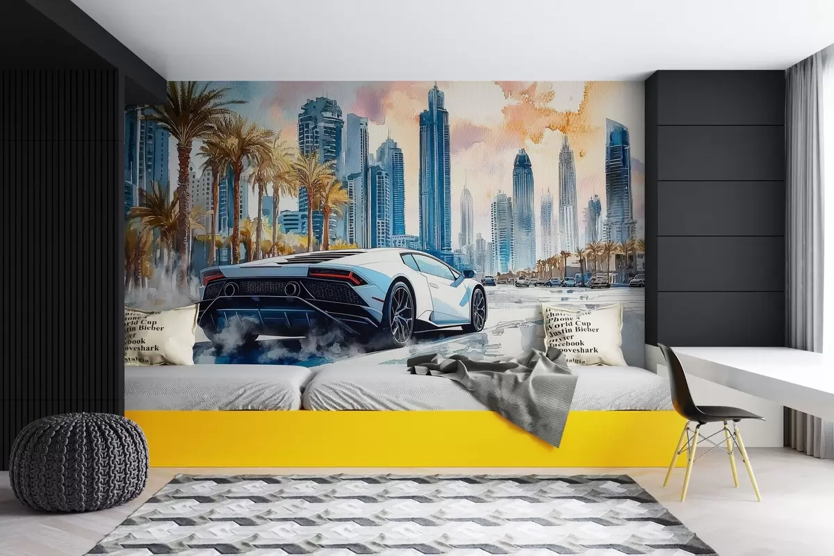 Fototapeten Ein weißer moderner Sportwagen, der vor dem Hintergrund von Palmen und Wolkenkratzern in freier Aquarelltechnik fährt N° w01963