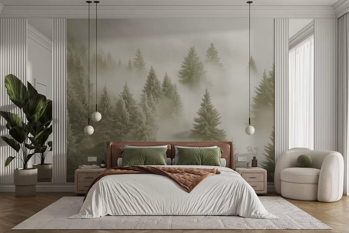 Fototapeten Dichter Nebel umhüllt einen verschneiten Morgenwald in sanften Grüntönen N° w02064v2