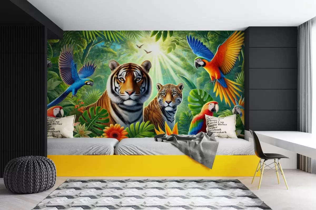 Fototapeten Farbenfrohe Fototapete mit einem Tropenpanorama mit Tigerpaar, Papageien und Blumen N° w02083