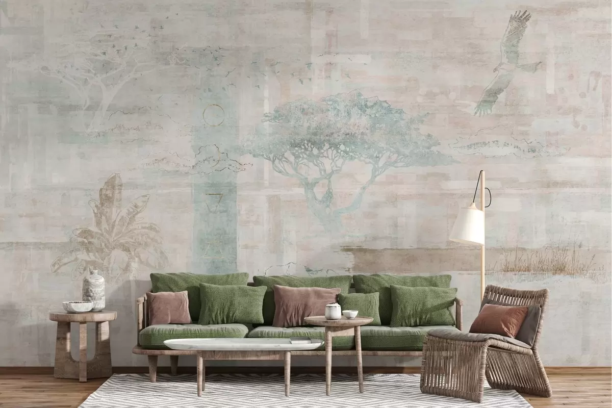 Fototapeten Vintage-Grunge-Effekt-Design mit Bäumen, Adler und geometrischen Elementen N° w02130