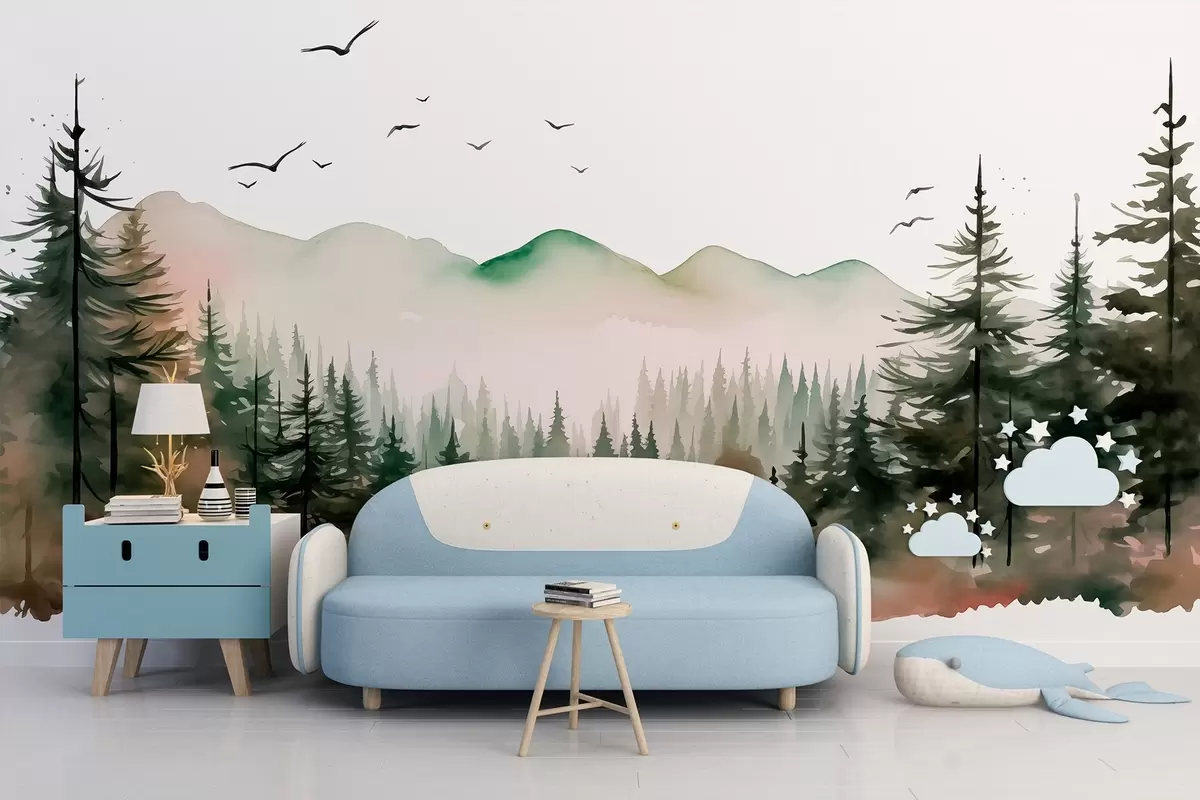 Fototapeten Aquarell Wald- und Berglandschaften, grüne und rosa Farben N° w02150v1