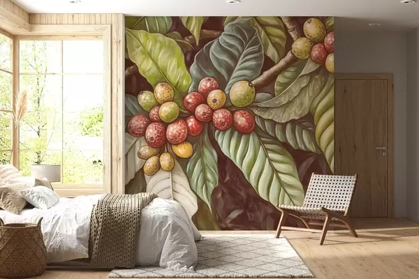Fototapeten Zweige einer Kaffeepflanze mit Früchten und tropischen Elementen N° w02209