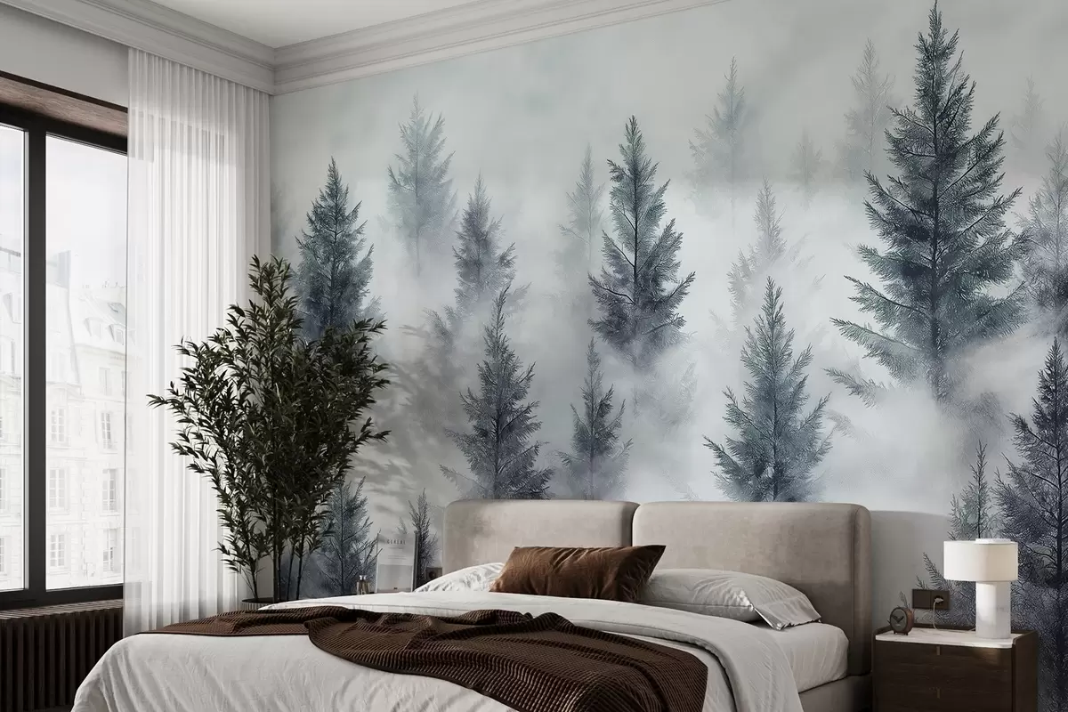 Fototapeten Schöner Wald mit Kiefern, Nebel, Naturlandschaften, graue Farben N° w02222v2