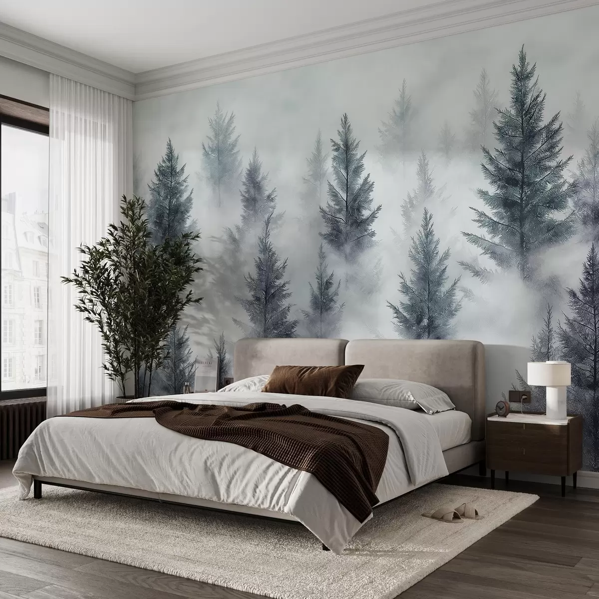 Fototapeten Schöner Wald mit Kiefern, Nebel, Naturlandschaften, graue Farben N° w02222v2