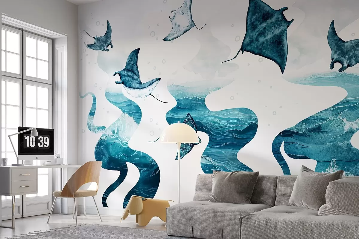 Fototapeten Manta Rochen Fisch, Aquarell-Stil, Meer, Ozean, blaue Farben N° w02266