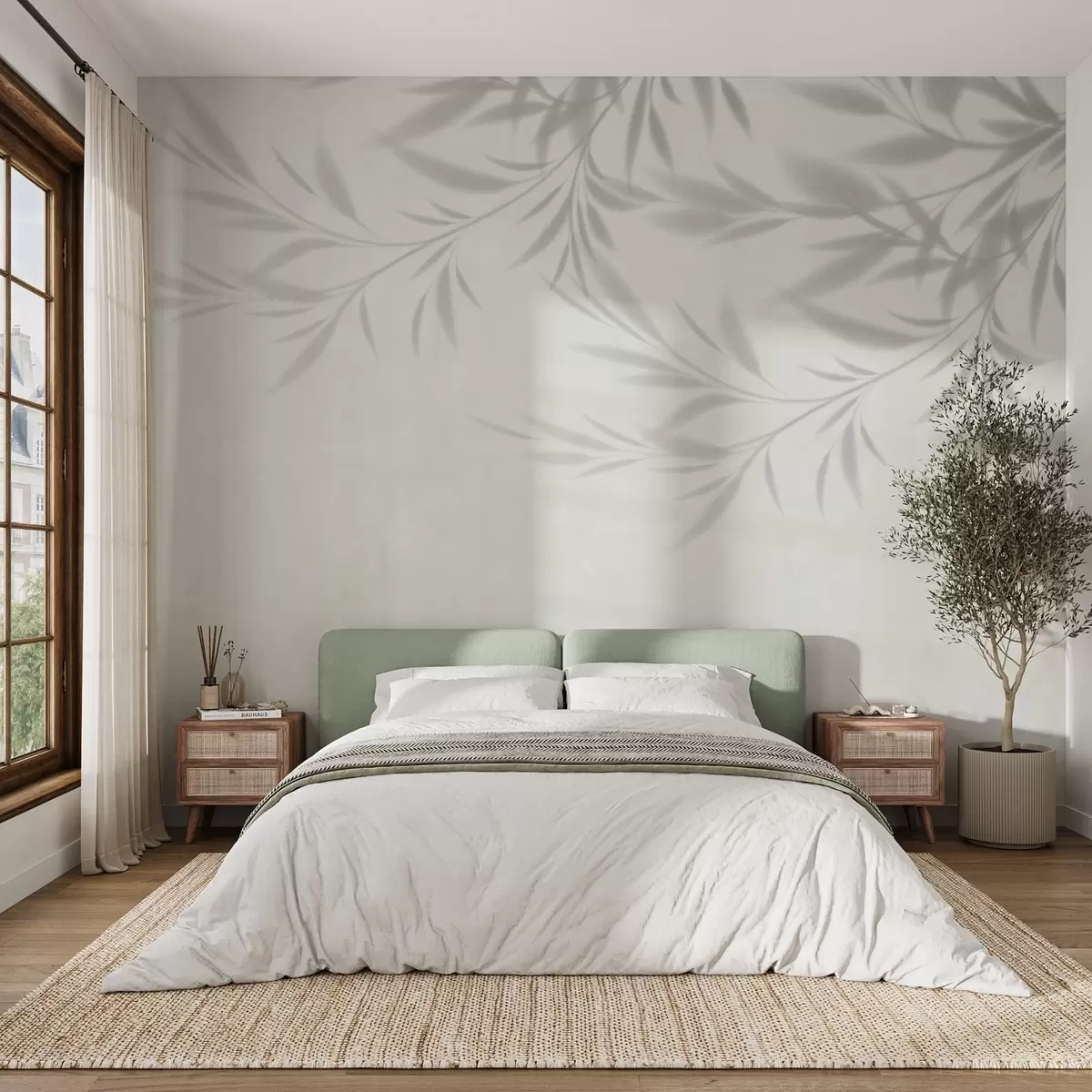 Fototapeten Schatten von Zweigen und Blättern auf einem olivgrünen Hintergrund N° w02283