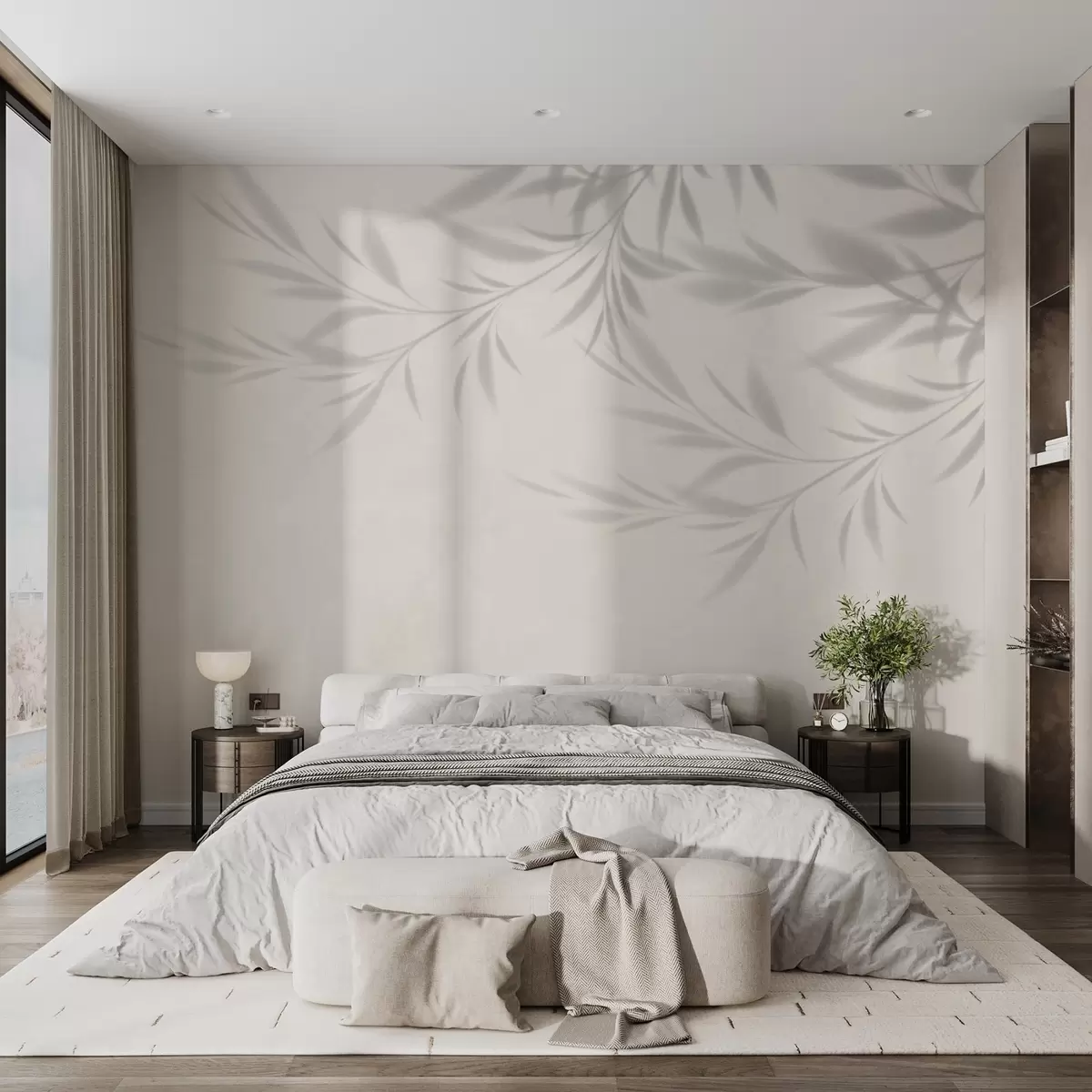 Fototapeten Schatten von Zweigen und Blättern auf einem beigen Hintergrund N° w02283v1