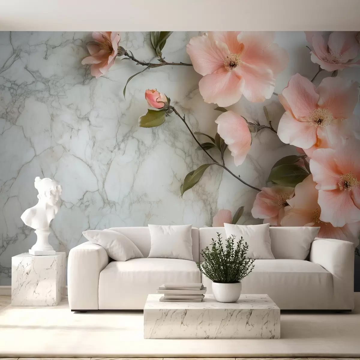 Fototapeten Zarte Blumen auf dem Hintergrund einer Marmorimitation N° w02291