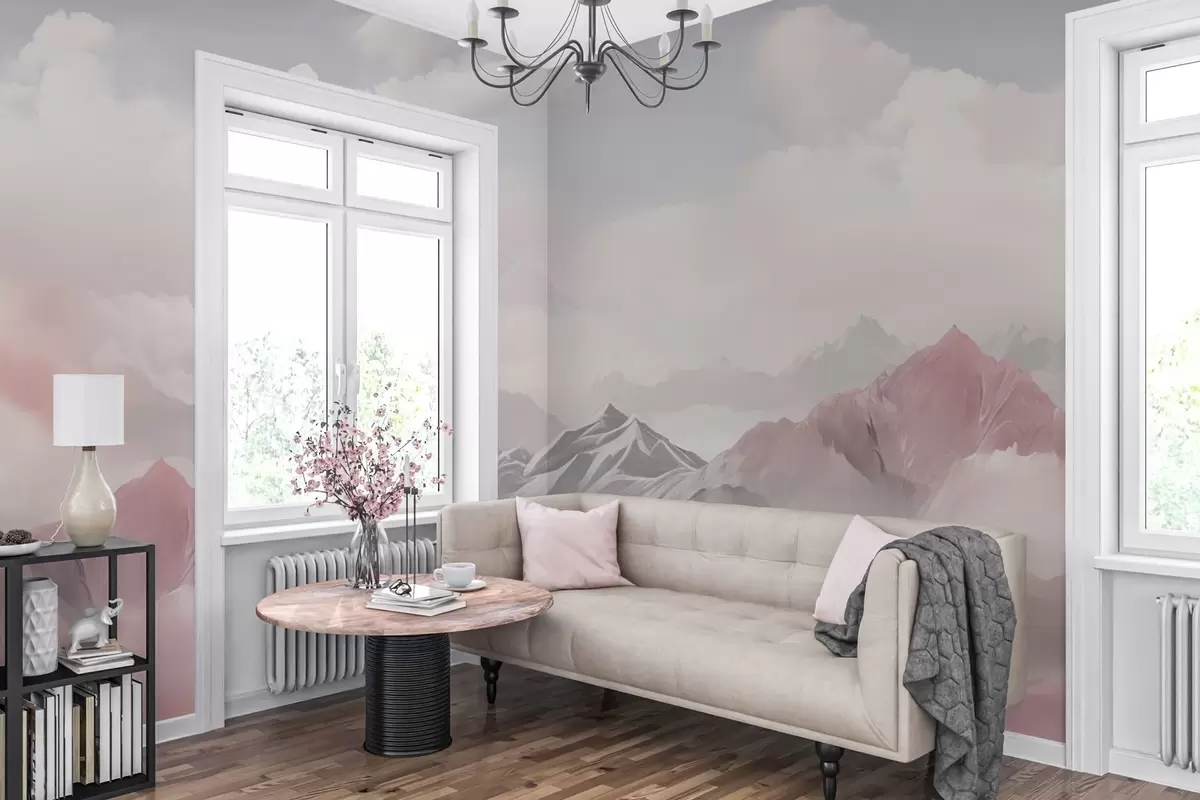 Fototapeten Rosafarbene Berge im Nebel und bauschige Wolken N° w02296
