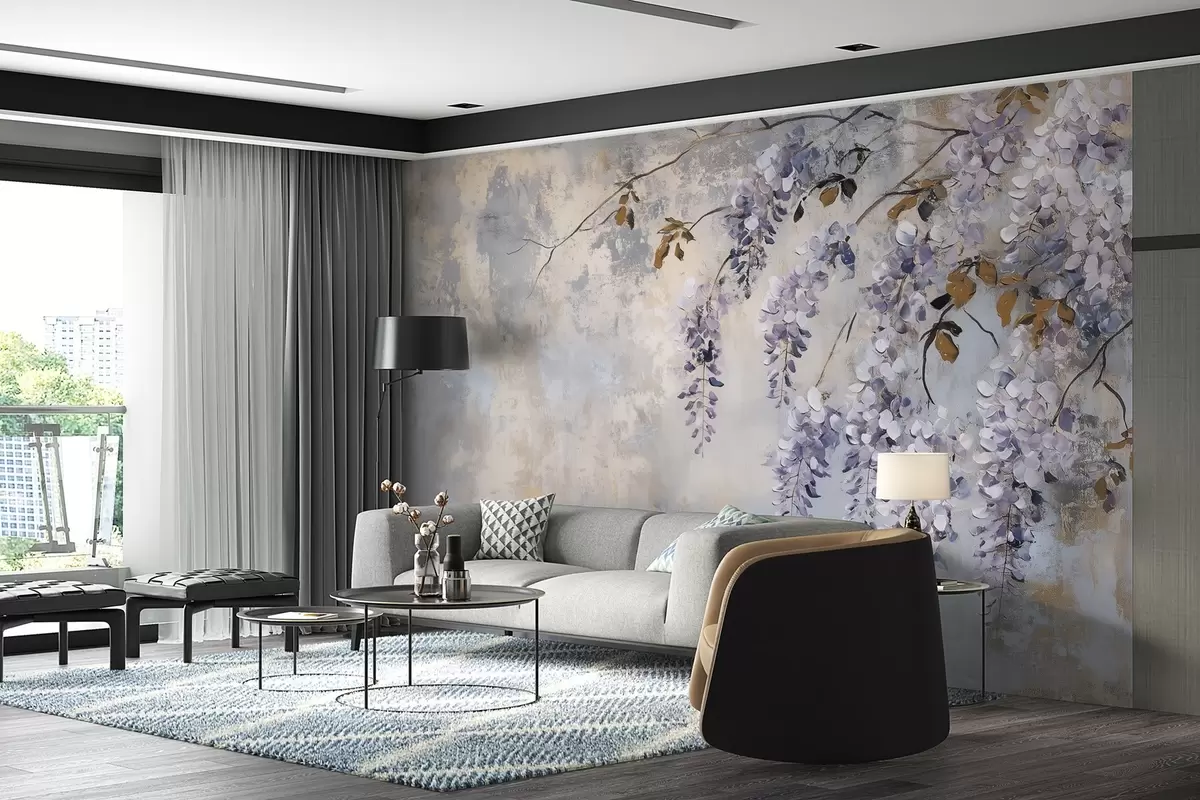 Fototapeten strukturtapete in weichen, gedeckten Farben mit zarten Glyzinienblüten und -zweigen. N° w02451