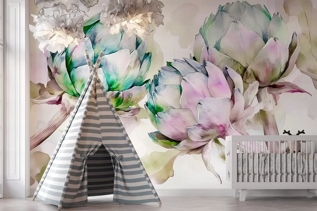 Fototapeten Artischocken im Aquarellstil, Blumen, lila und grün N° w02481
