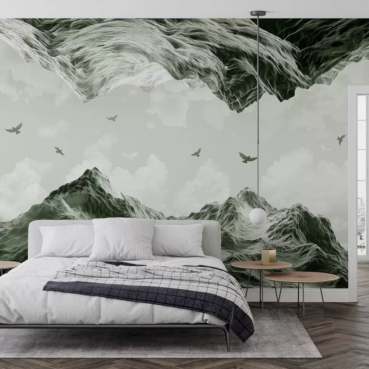 Fototapeten Berge Landschaft, Realismus, fliegende Vögel, Natur, Wolken, grüne Farben N° w02514v3
