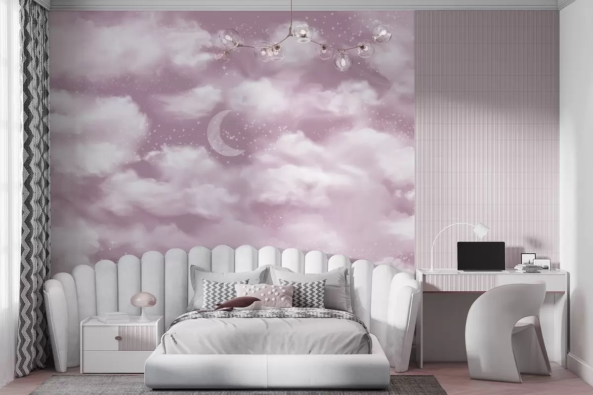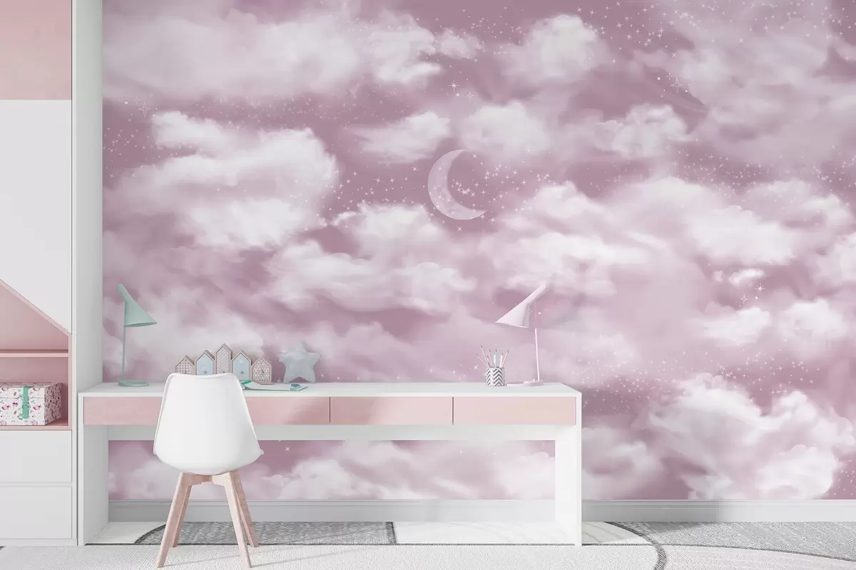 Fototapeten Sternenhimmel mit Mond und Wolken, verträumt, ätherisch, zartrosa Farben N° w02515v3