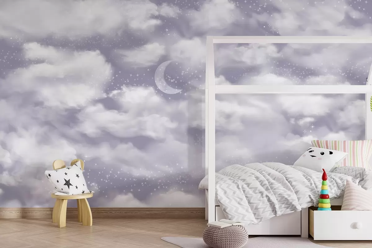 Fototapeten Sternenhimmel mit Mond und Wolken, verträumt, ätherisch, weiche lila Farben N° w02515v4