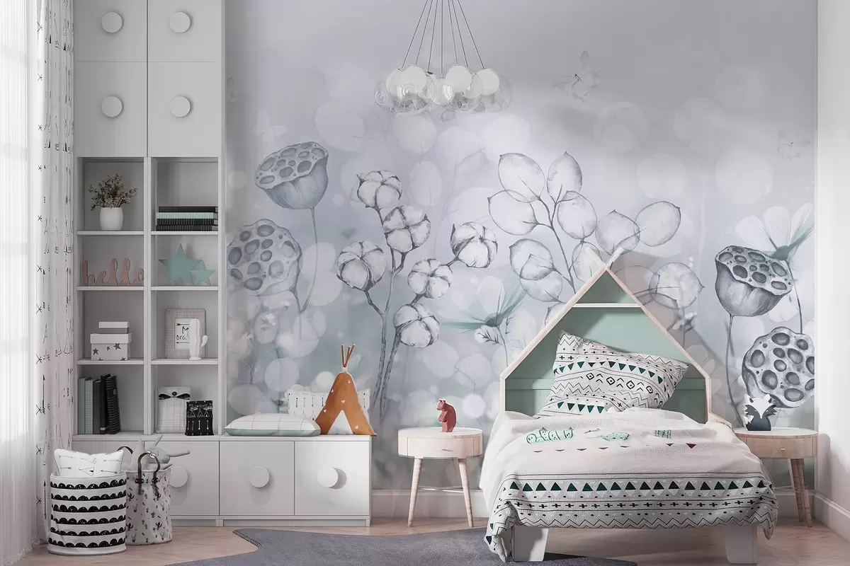 Fototapeten Verträumter Blumengarten, Schmetterling, Baumwollblumen, Lotusblumen, graue Farben N° w02516v2
