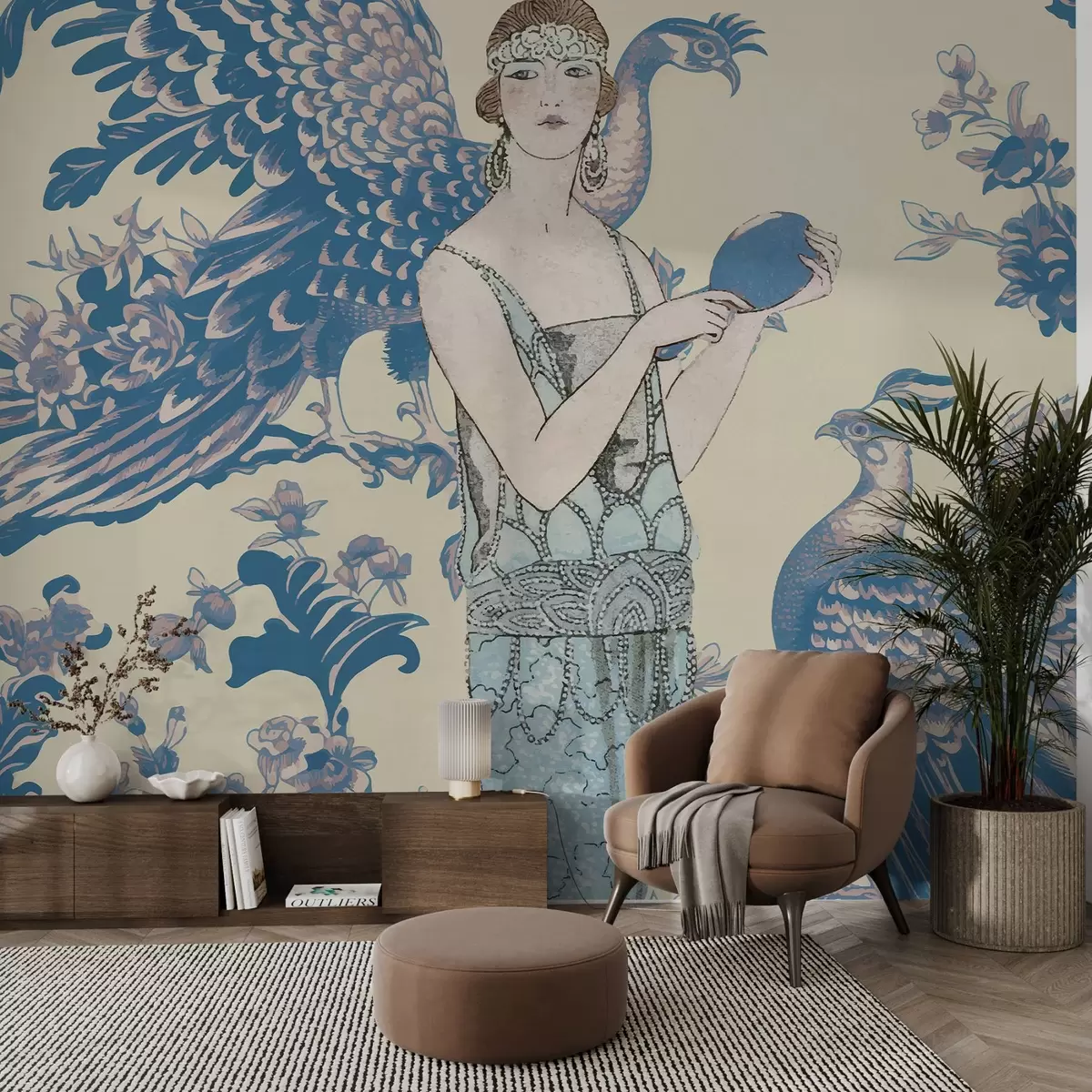 Fototapete Elegantes florales Vintage-Muster mit einer Frau in blauen und rosa Farbtönen w02532