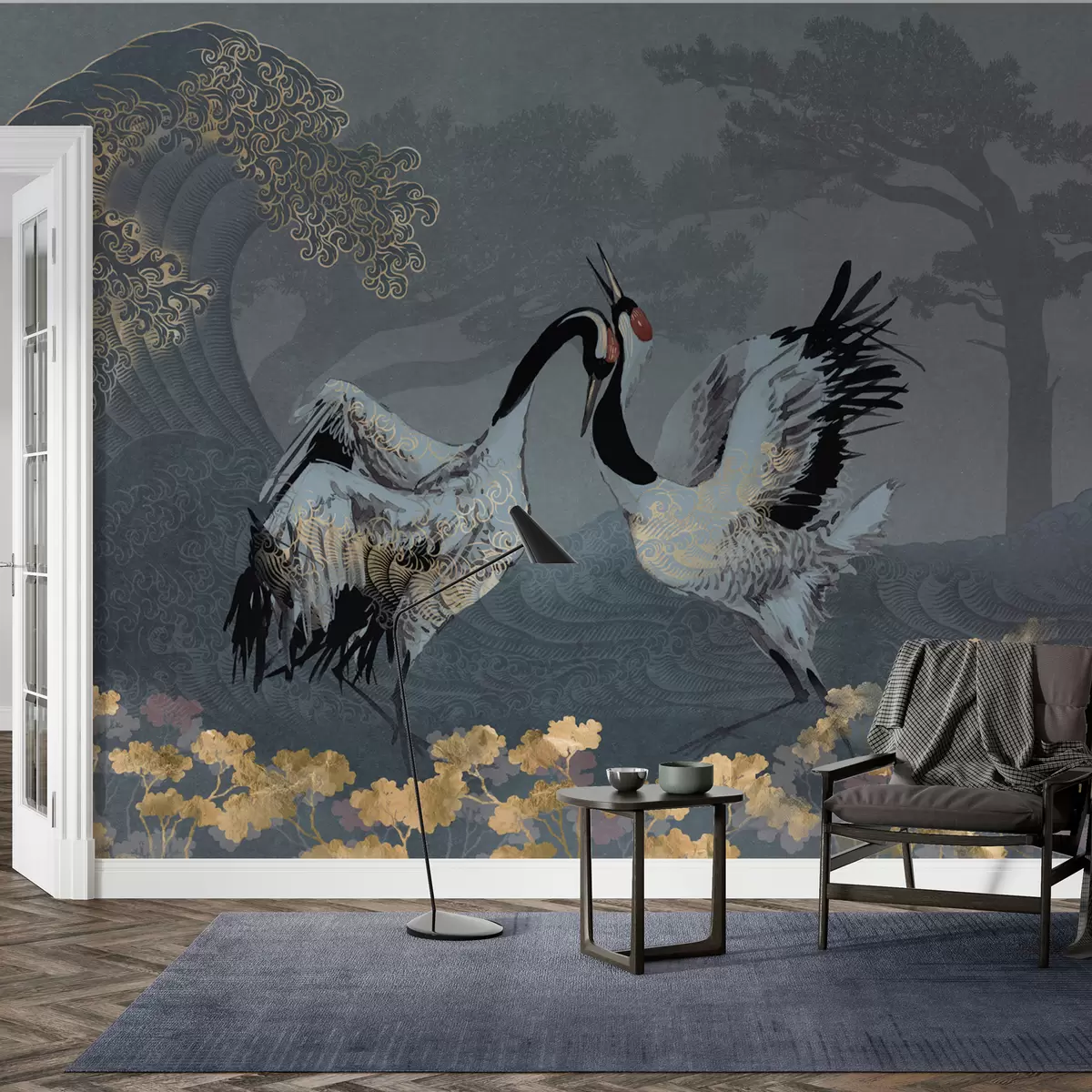 Fototapeten Kraniche, Bäume und Wellen mit chinesischen Stilelementen N° w02747