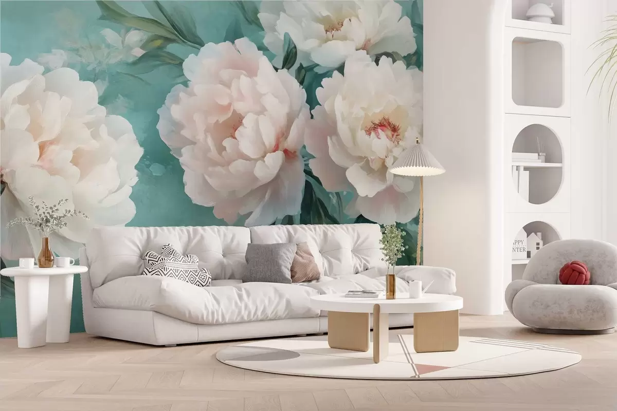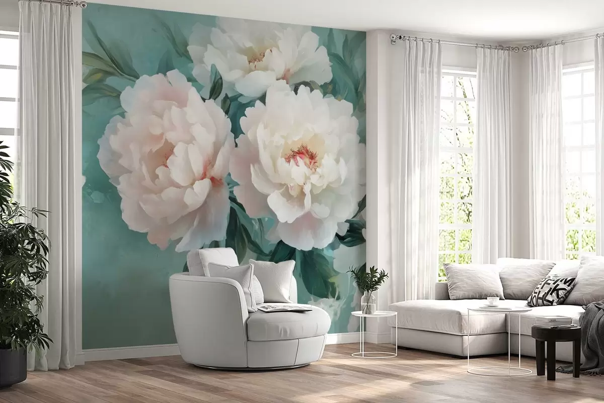 Fototapeten große Blüten von üppigen Pfingstrosen auf türkisfarbenem Hintergrund N° w02763