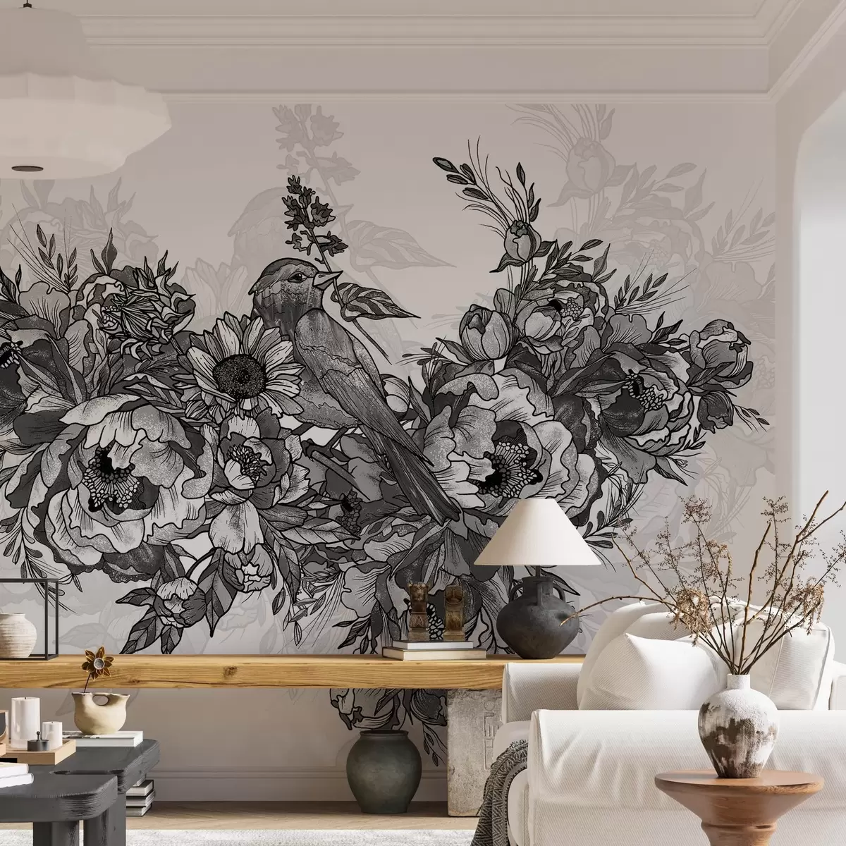 Fototapeten Monochrome Blumen- und Vogelkomposition N° w02834