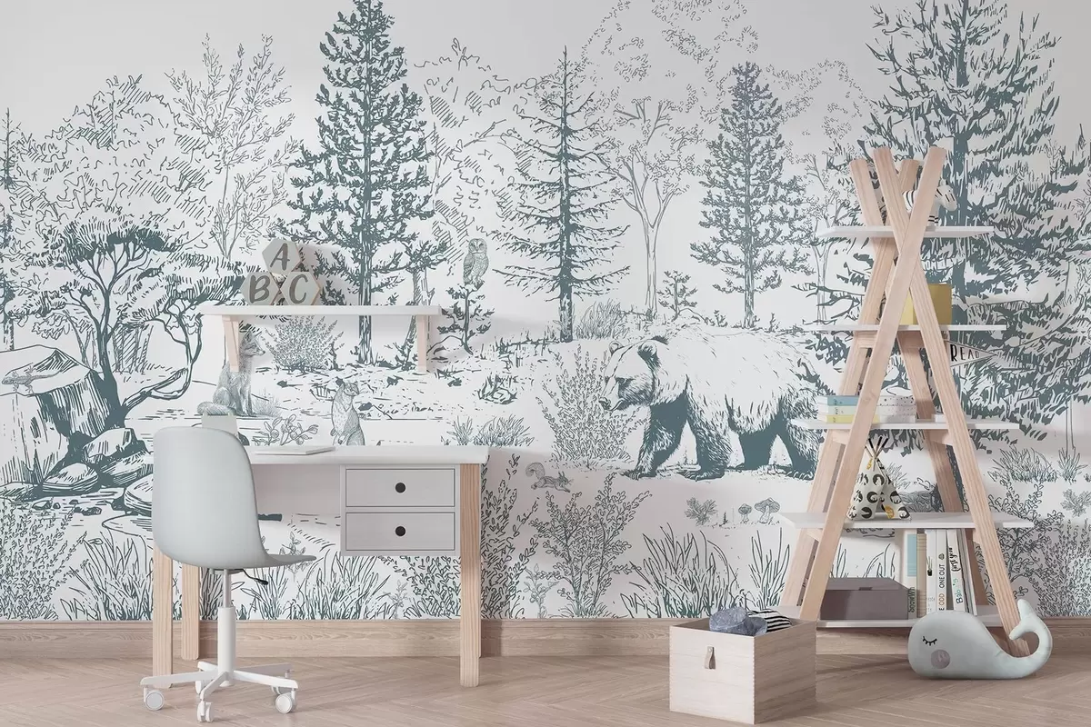 Fototapeten Waldleben, Bäume, wilde Tiere, Bär, Fuchs, Eule, Büsche, Bleistift-Stil Zeichnung, blaue Farben N° w02929v1