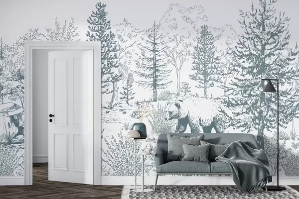 Fototapeten Waldleben, Bäume, wilde Tiere, Bär, Fuchs, Eule, Büsche, Bleistift-Stil Zeichnung, blaue Farben N° w02929v1