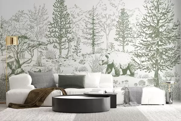 Fototapeten Waldleben, Bäume, wilde Tiere, Bär, Fuchs, Eule, Büsche, Bleistift-Stil Zeichnung, grüne Farben N° w02929v2