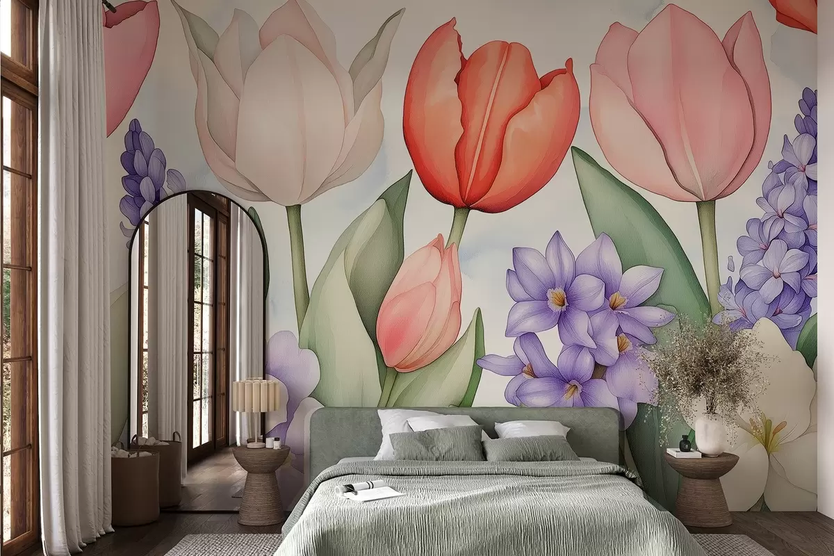Fototapeten Frühlingsblumen, Tulpen, Hyazinthe, Aquarell-Stil Zeichnung, floral N° w02940
