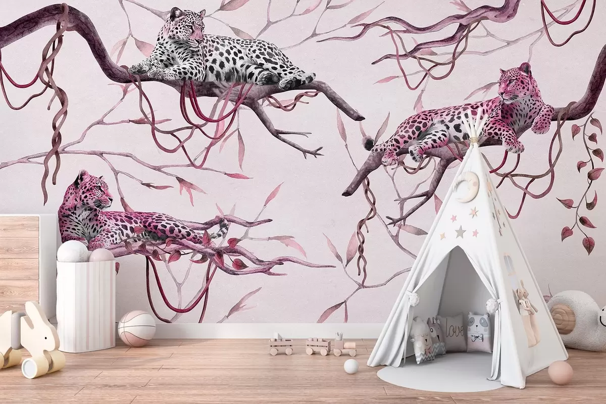 Fototapeten Leoparden auf den Dschungelbäumen, Lianen, tropische, wilde Tiere, rosa Farbpalette N° w03146v2