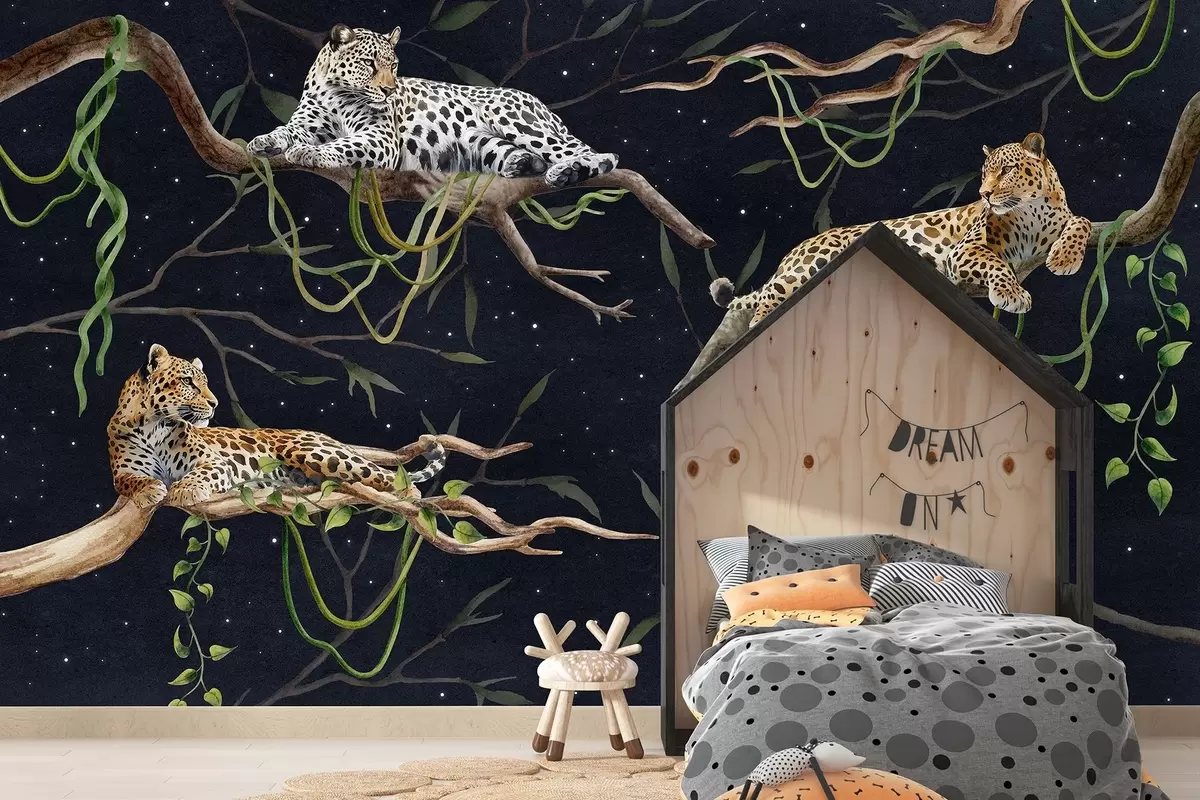 Fototapeten Leoparden auf den Dschungelbäumen, Lianen, tropische, wilde Tiere, Nachthimmel mit Sternen N° w03148