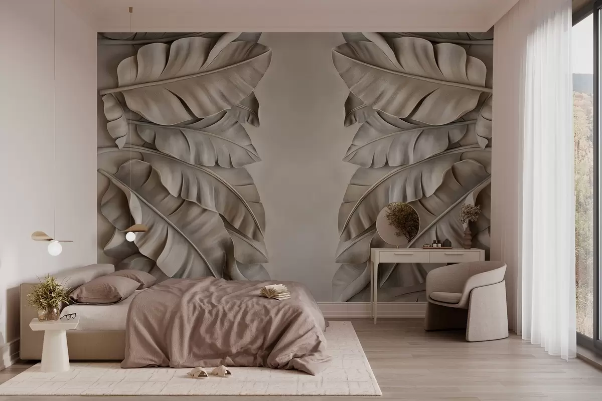 Fototapeten nachahmung eines Flachreliefs mit tropischen Blättern in Beigetönen N° w03285