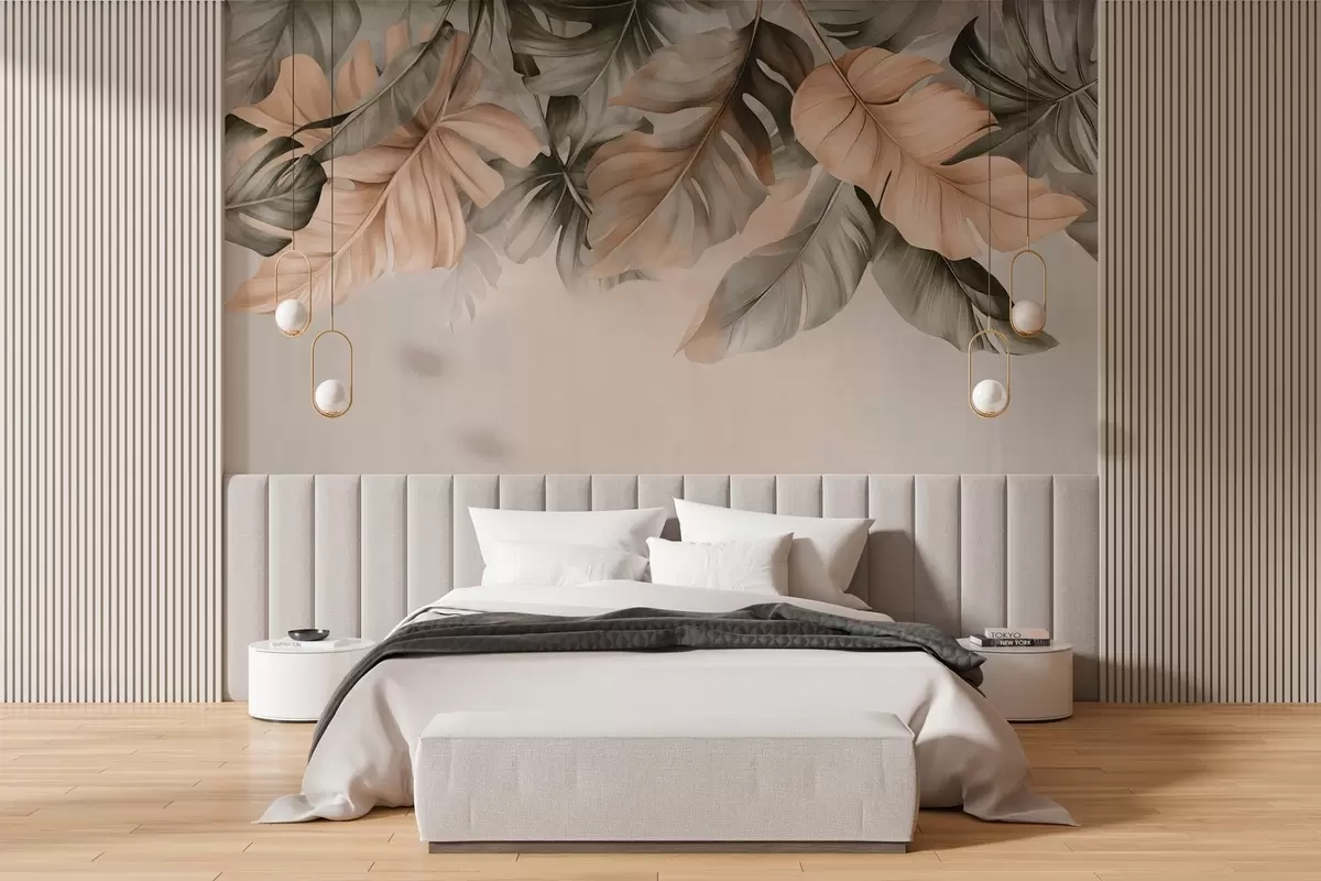 Fototapeten Tropische Blätter, die von oben herabhängen, auf einem strukturierten Hintergrund N° w03290