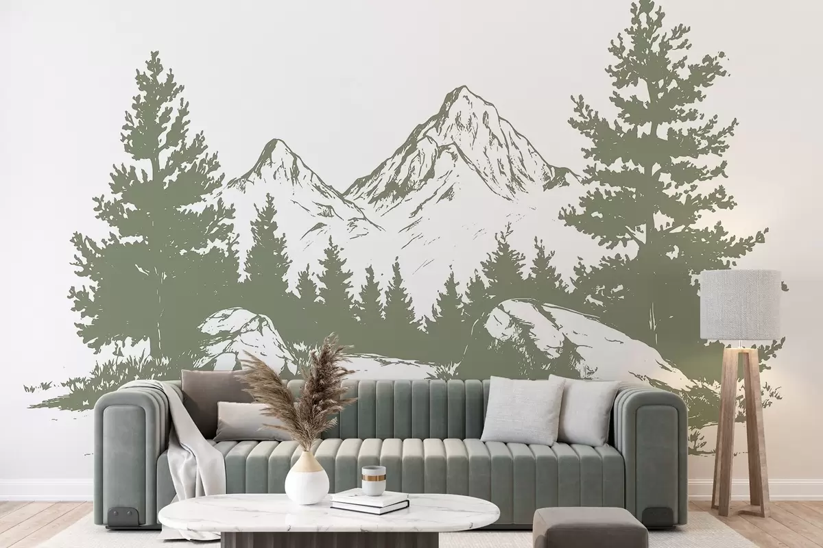 Fototapeten Die Alpen, Berge mit Wald, Strichzeichnung, grüne Farbe N° w03342v1