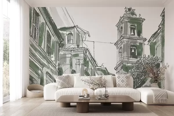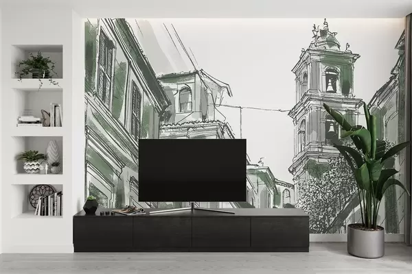 Fototapeten Mittelmeer-Stadtstraße, Kapelle, Architektur, graue und grüne Farben N° w03350v2