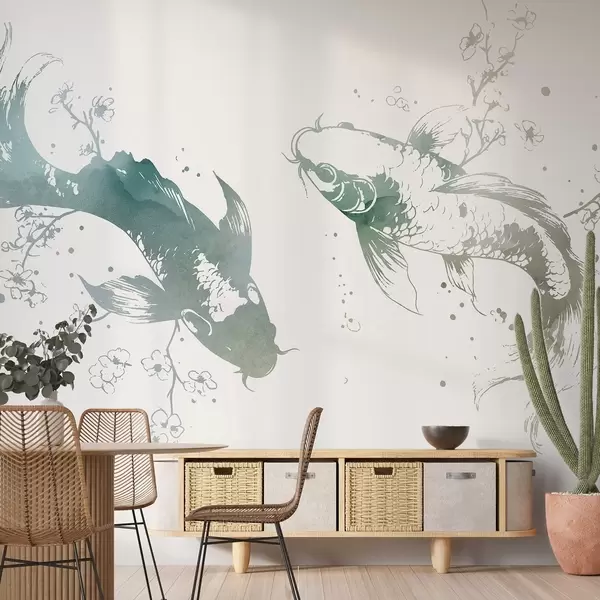 Fototapeten Aquarellfisch, orientalischer Stil, Kirschbaum, grüne Farben N° w03447v2