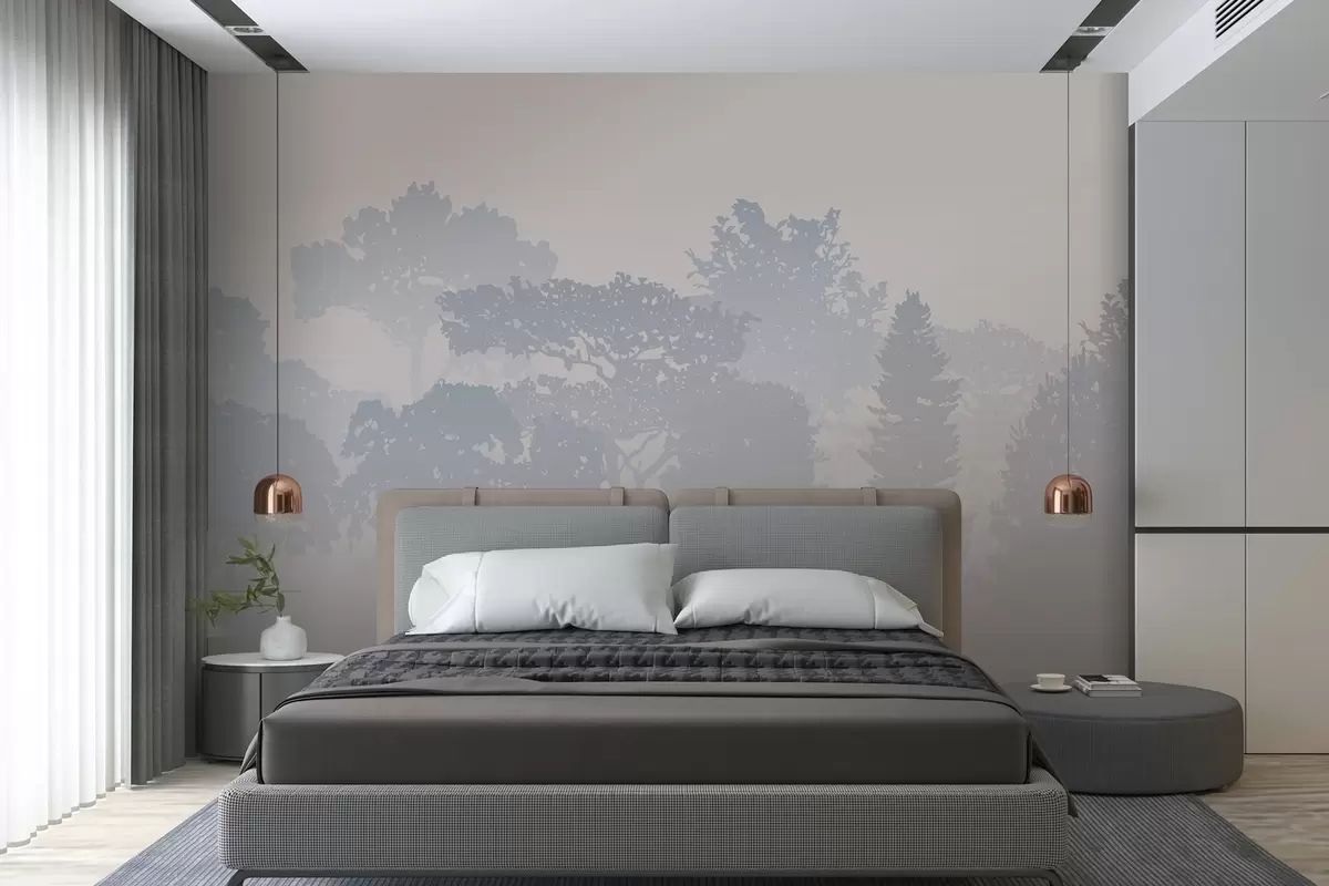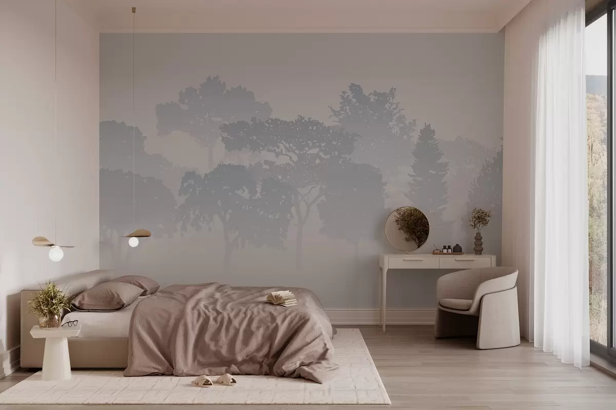 Fototapeten silhouetten von Bäumen im Dunst des Nebels N° w03451