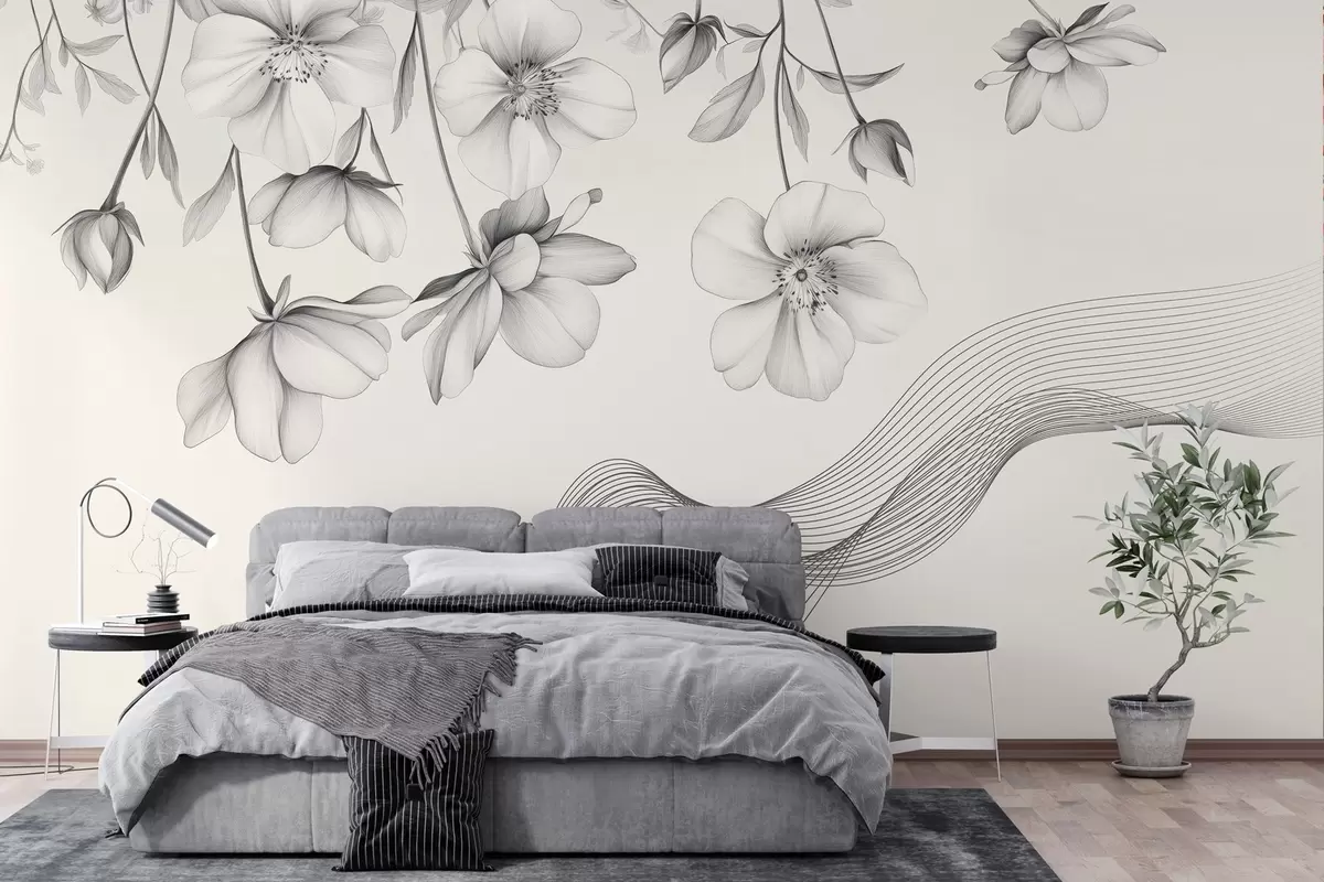 Fototapeten grafische Blumen und Linien auf hellem Hintergrund N° w03454