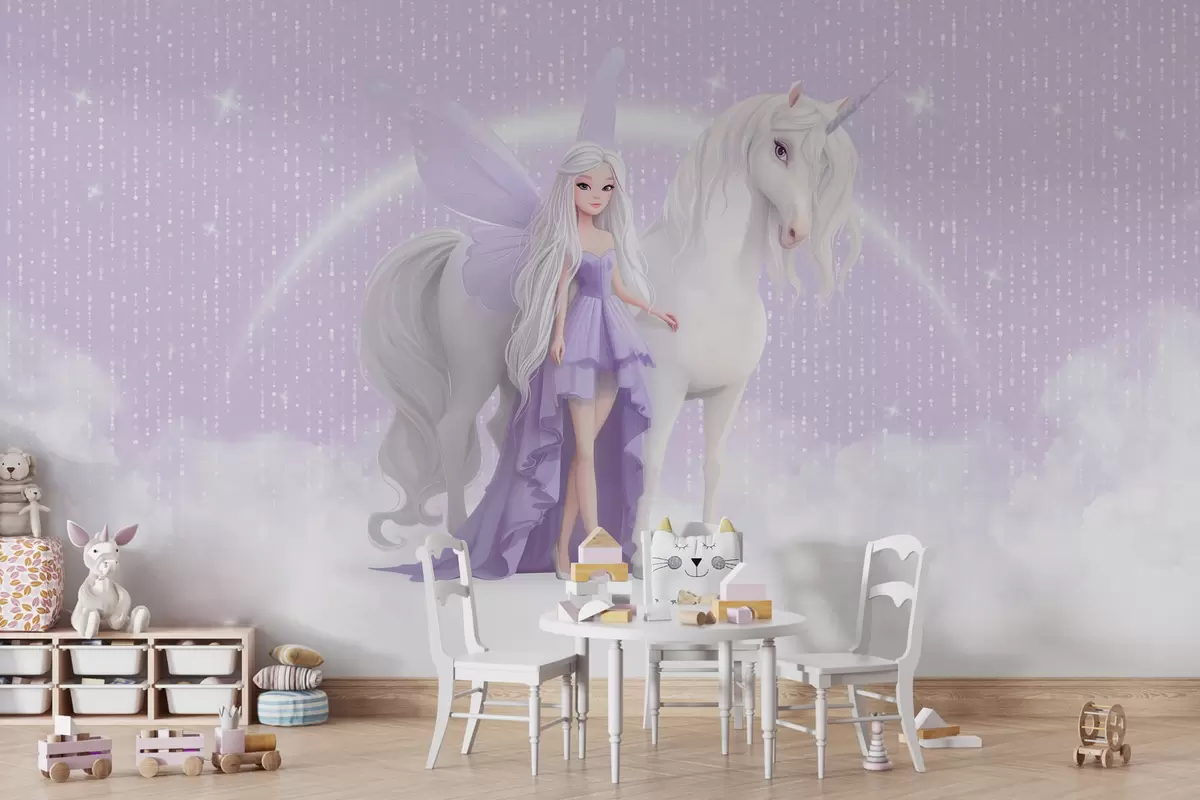 Fototapeten Eine Fee mit einem Einhorn in den Wolken N° w03527