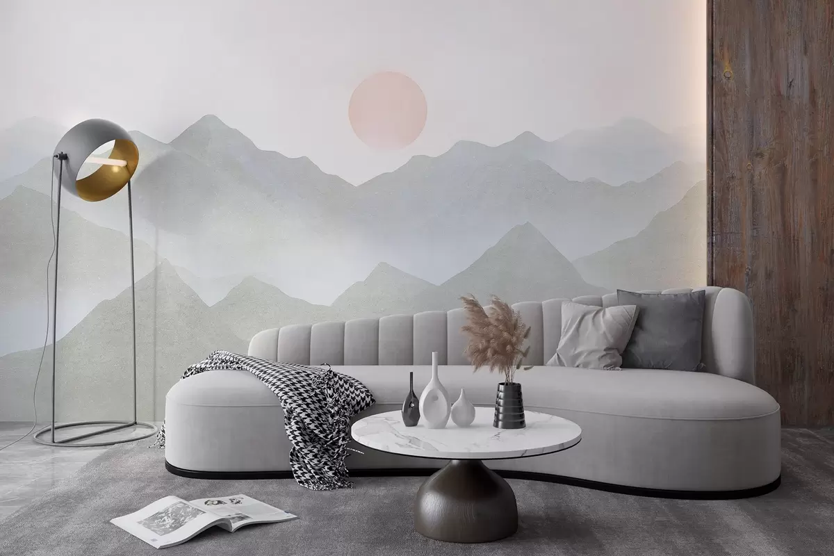 Fototapeten Boho-Stil Berge Landschaft, Sonnenuntergang, weichen Pastell, grau N° w03547v1