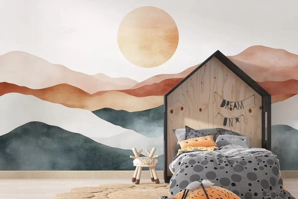 Fototapeten Aquarell Berge mit der Sonne, Boho-Stil, rot, orange, grau N° w03551
