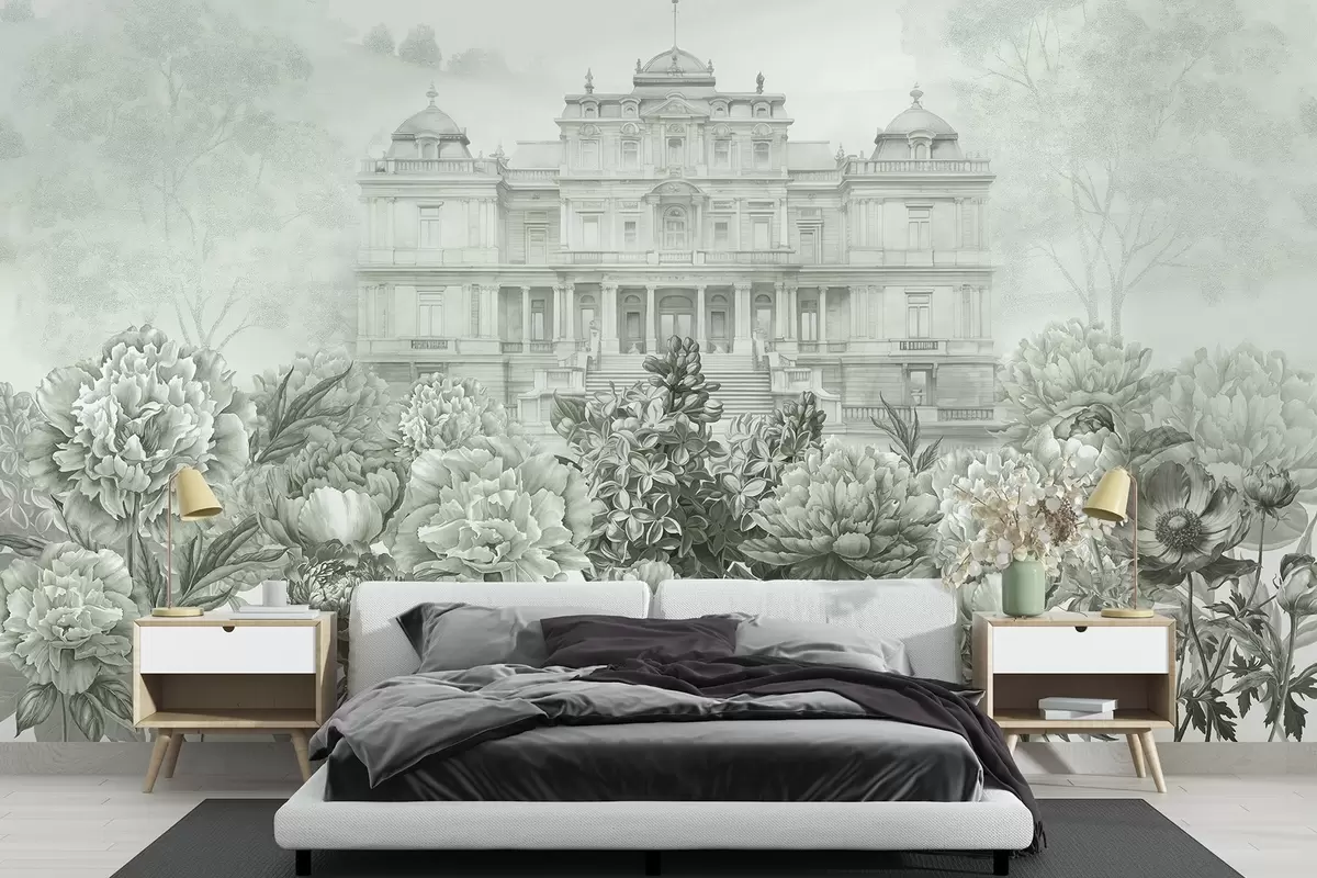 Fototapeten Königlicher Palast mit Pfingstrose Garten, Aquarell-Stil, Natur, grüne Farben, Boho N° w03552v2