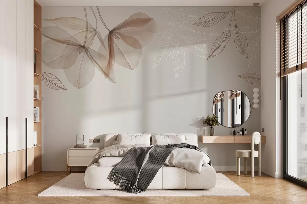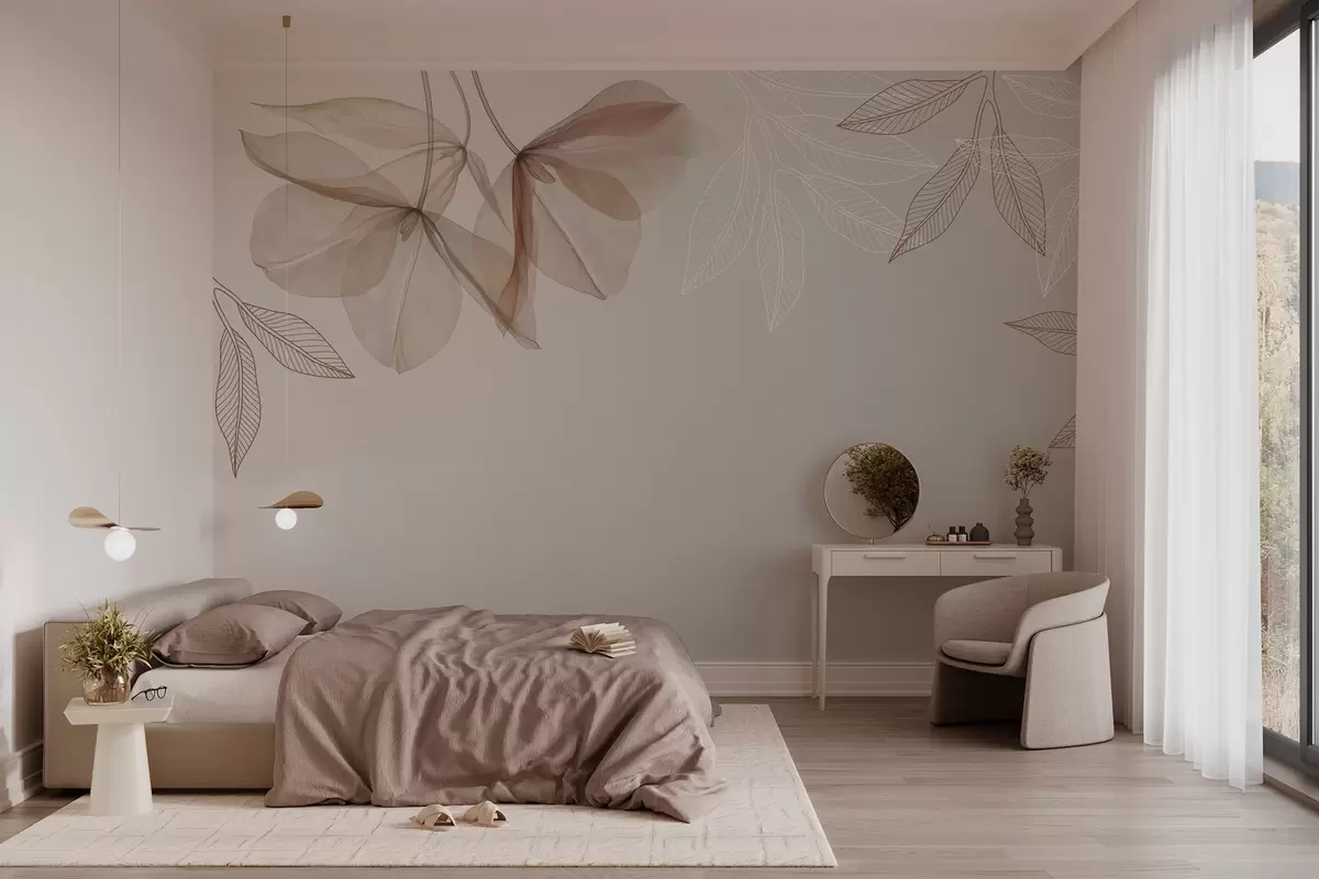 Fototapeten zarte durchscheinende Blüten und Blätter in Mokkatönen N° w03616v3