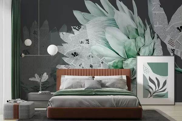 Fototapeten Protea Blumen, Zeitungskunst, floral, tropisch, dunkler Hintergrund, grüne Farben N° w03667v3